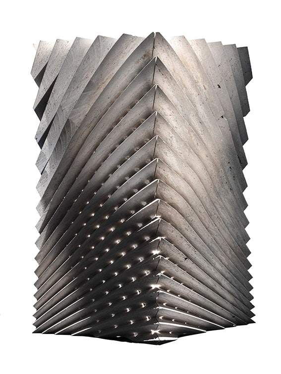 Virtuosismo litico. Il tradizionale taglio a disco diamantato è reinterpretato partendo da due blocchi di marmo massello di grosso spessore uniti insieme e lavorati su tre dimensioni con macchine a controllo numerico attraverso ardui percorsi di taglio curvi e distribuiti su una superficie ondulata. La macchina lavora sulle due facce del blocco realizzando solchi a V e plasmando una superficie a pieghe su ambo i lati. Gli apici delle pieghe si intercettano e creano una serie di aperture romboidali attraverso le quali filtra la luce.