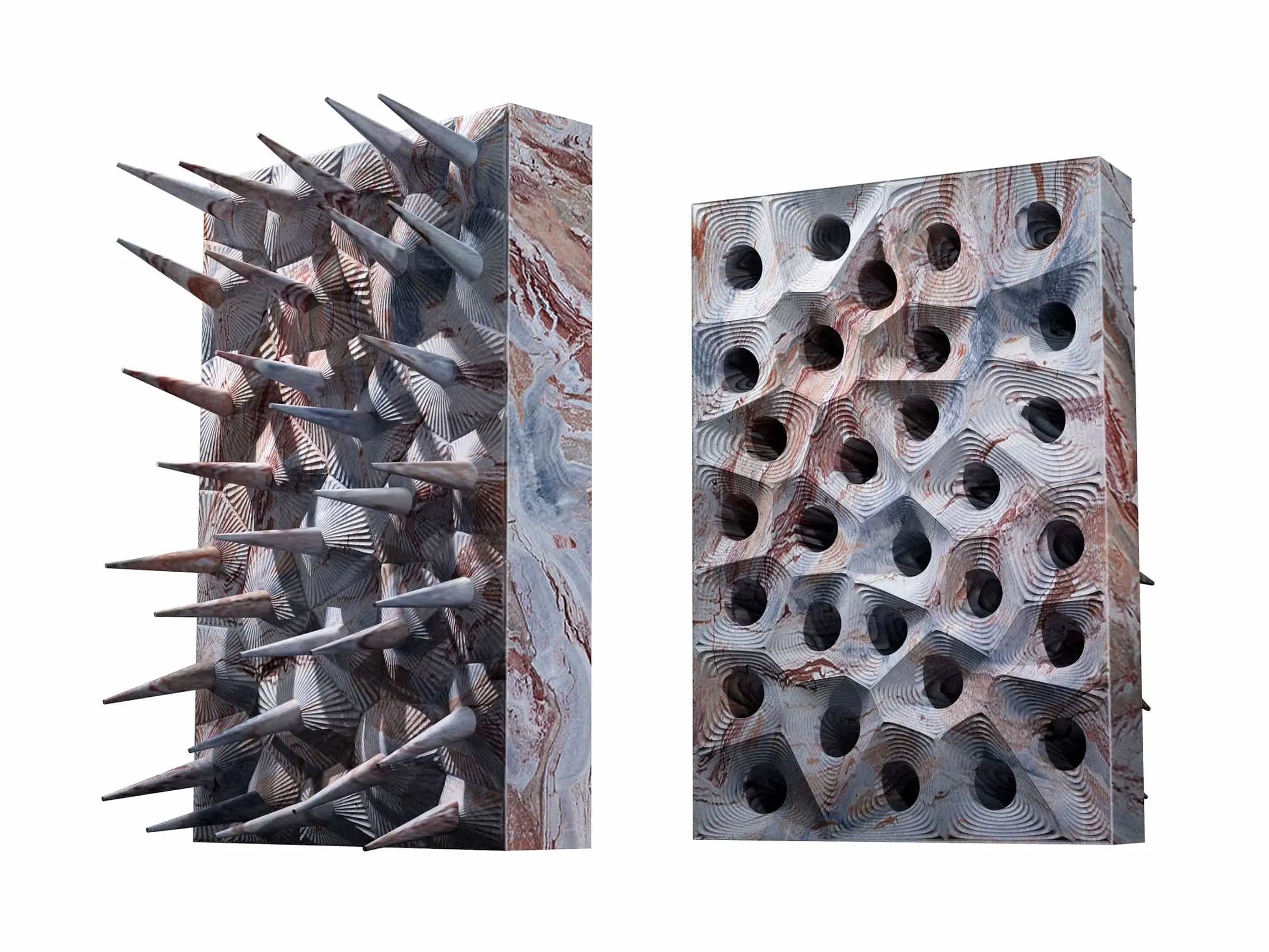 Virtuosismo litico. Il tradizionale taglio a disco diamantato è reinterpretato partendo da due blocchi di marmo massello di grosso spessore uniti insieme e lavorati su tre dimensioni con macchine a controllo numerico attraverso ardui percorsi di taglio curvi e distribuiti su una superficie ondulata. La macchina lavora sulle due facce del blocco realizzando solchi a V e plasmando una superficie a pieghe su ambo i lati. Gli apici delle pieghe si intercettano e creano una serie di aperture romboidali attraverso le quali filtra la luce.
