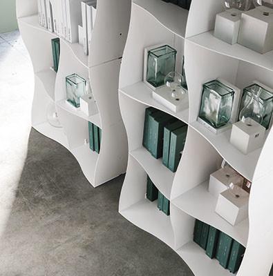 Iron-ic interpreta l’ambiente con un mood fortemente contemporaneo, la variazione armonica dei piani orizzontali e verticali in lamiera sagomata dona un’innata leggerezza e fluidità alla libreria. Il ferro in versione al naturale con cui è realizzata le regala un tono grintoso ed attraente; un risultato più morbido si ottiene, invece, nella proposta in verniciato bianco. Iron-ic, inoltre, alza le possibilità di customizzazione offrendo una ulteriore possibilità di scelta delle “schiene” dei moduli proposte in diverse essenze di legno nell’ottica di una forte personalizzazione della libreria.