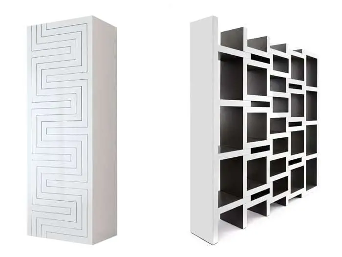 Realizzata in HPL, un laminato compatto e leggero, la libreria REK è disponibile in diversi colori, dal bianco a tre tonalità di grigio.
