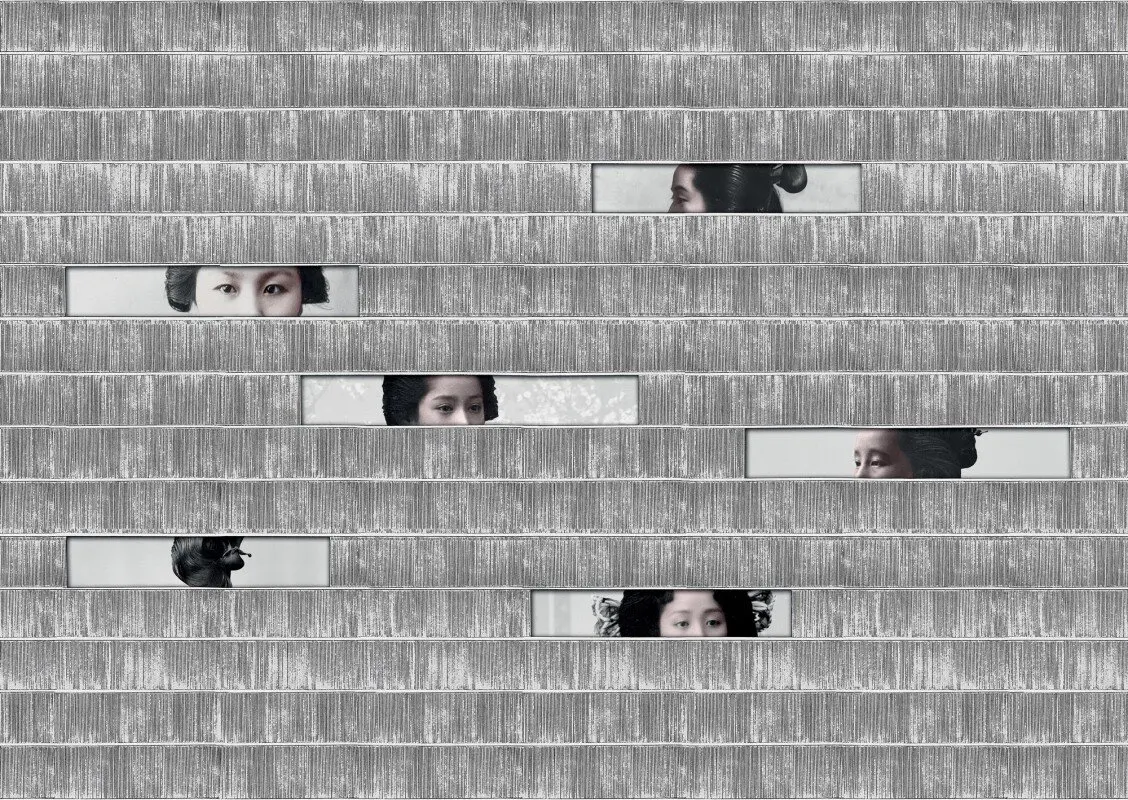 Da uno sfondo fitto di vegetazione rigogliosa, si stagliano figure di donne ritratte mentre compiono gesti di vita quotidiana come un semplice lavaggio dei capelli, una passeggiata riparate dal sole con un ombrello oppure mentre sono comodamente sedute. Si tratta di fotografie d’epoca, risalenti a inizio Novecento, quando il Giappone è completamente affascinato dai prodigi delle prime macchine fotografiche d’importazione.