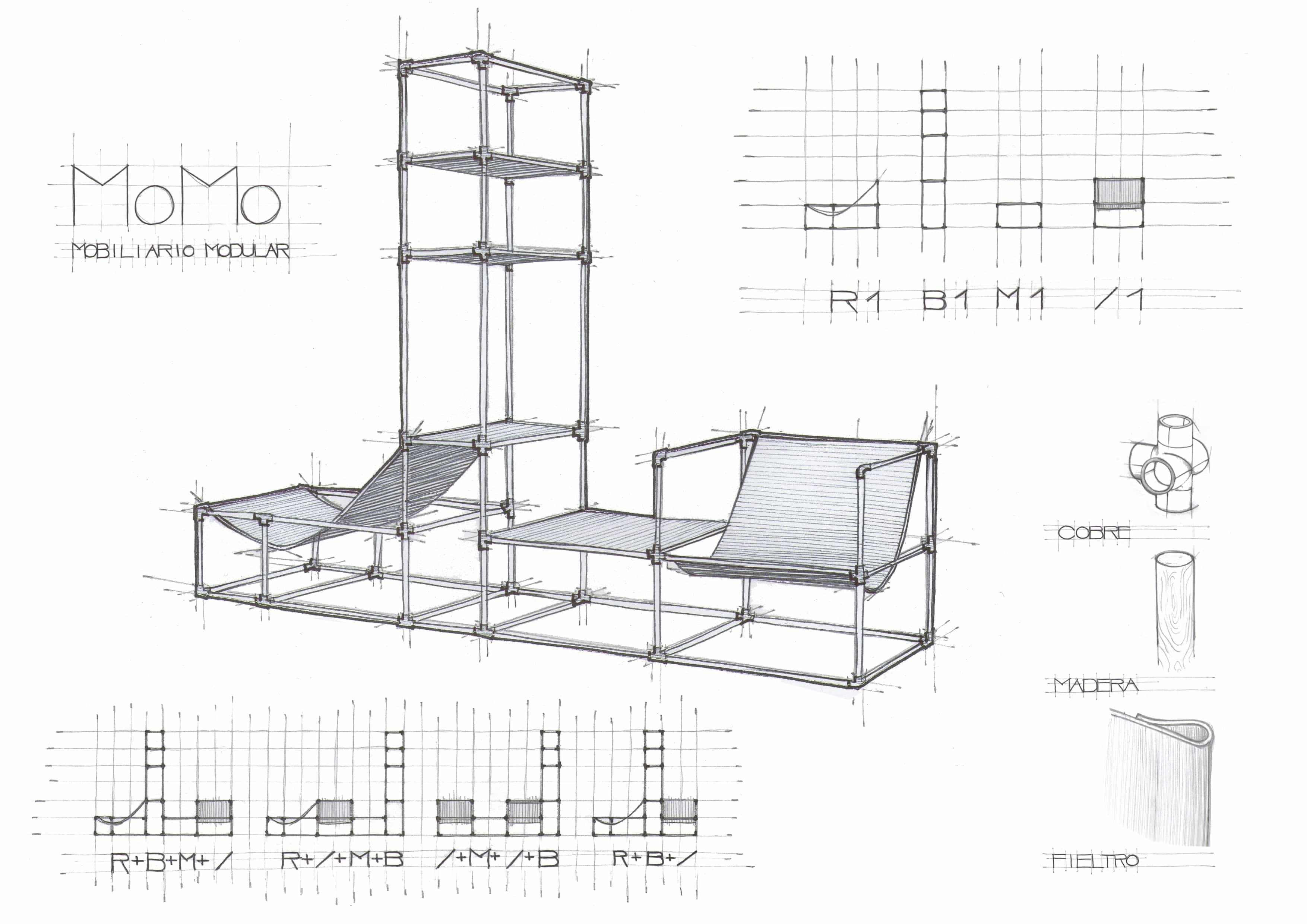 La struttura è concepita come un sistema aperto e dinamico, che offre una varietà di combinazioni per soddisfare le diverse esigenze di arredo: i quattro diversi moduli che compongono MoMo, una sedia, una sedia a sdraio, uno scaffale ed un tavolino, possono vivere singolarmente oppure essere uniti tra di essi.
