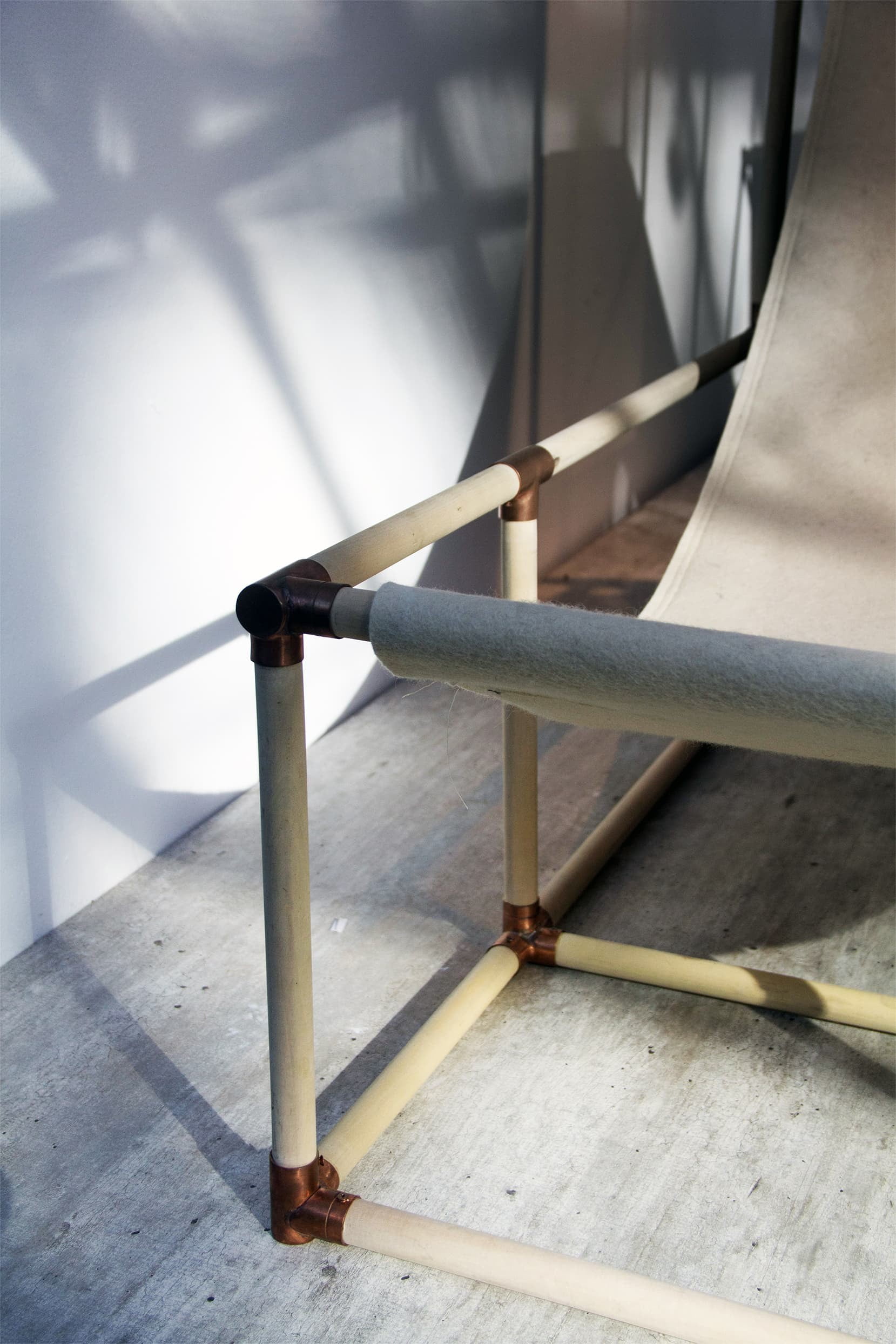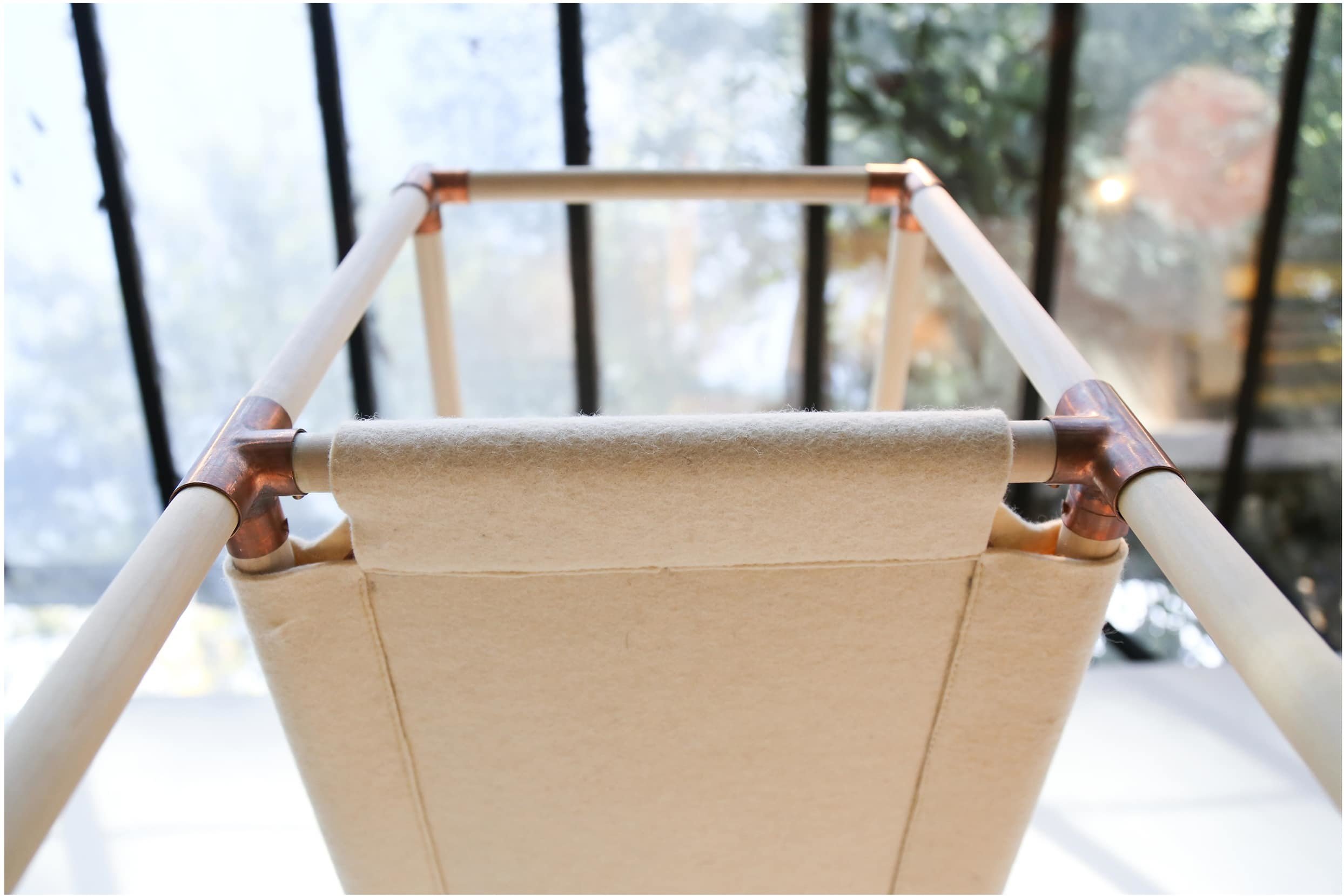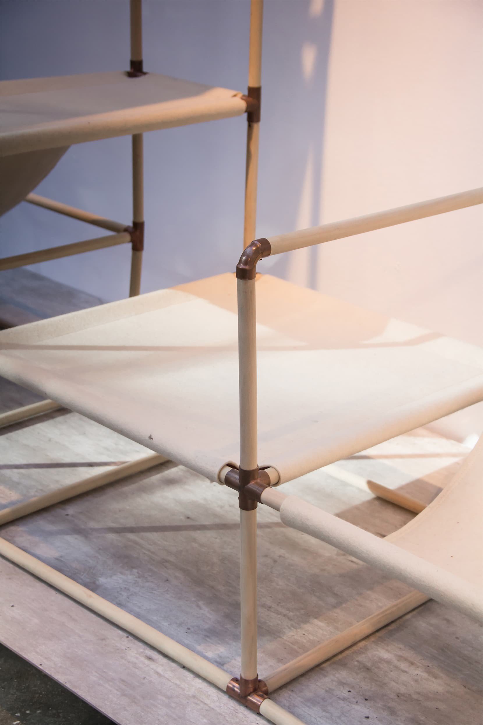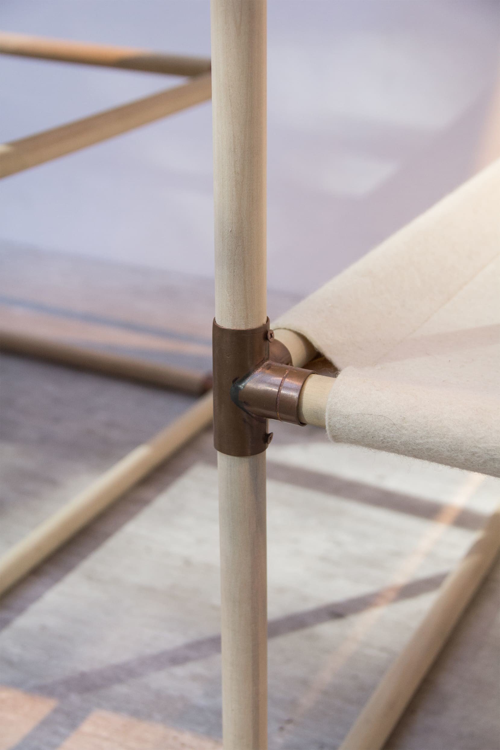 Elegante e leggiadro, il mobile componibile è realizzato in legno naturale. Gli elementi lignei, a sezione circolare, sono congiunti da raccordi in rame. Le sedute, la base del tavolo ed i piani dello scaffale sono in realizzati in feltro.