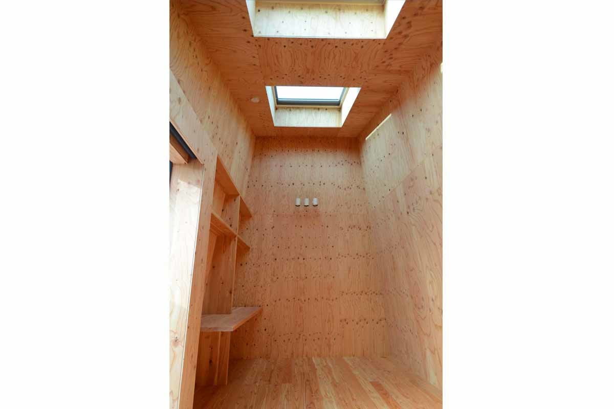 La superficie contenuta di 27 metri quadrati ha comportato lo sviluppo degli ambienti in altezza, destinando il piano terra a garage ed organizzando un monolocale nel livello superiore, accessibile attraverso una scala esterna laterale.