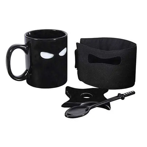 Ninja Mug è la tazza in ceramica nera mascherata da ninja, con tanto di maschera per non scottarsi, cucchiaino a forma di Katana e poggia tazza a forma di Shurikene, la famosa stella ninja. Acquistabile qui.