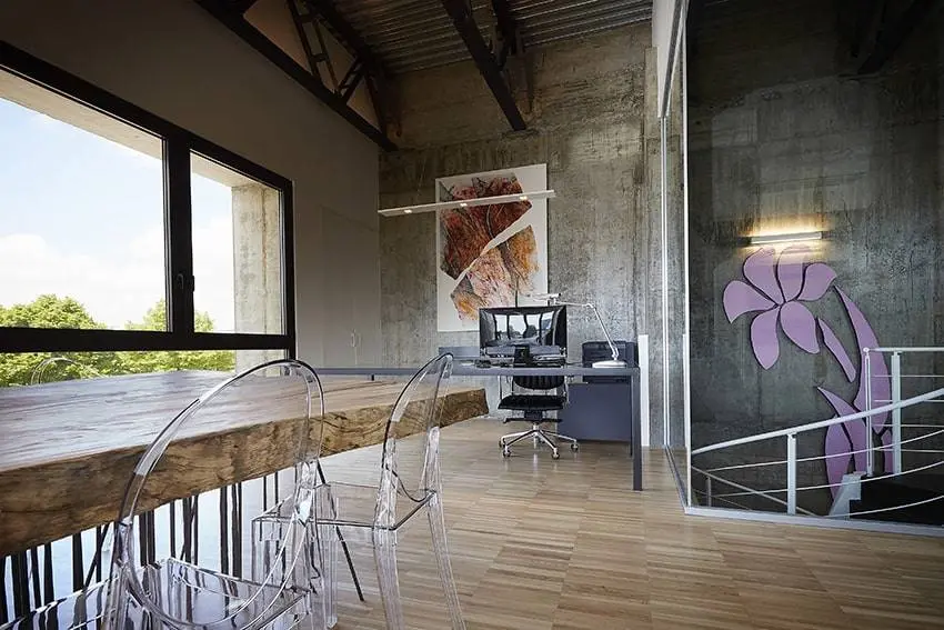Singolari ed empatici gli arredi e i complementi che sono stati personalizzati con l’uso del legno antico. I tavoli dei diversi ambienti sono stati creati su disegno come lo scultoreo ampio tavolo della sala riunioni dove la grande massa lignea è supportata da 120 tondini di ferro da 1 cm.