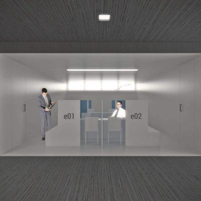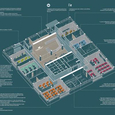 L’idea progettuale gioca sul tema “della scatola nella scatola”. Le aree individuate dal documento programmatico sono state declinate nello spazio come indipendenti e connesse con l’intorno. Le scelte formali, pertanto, sono state orientate ad articolare gli ambienti ed esprimere flussi, spazialità e dinamicità; allo stesso tempo trova risposta la necessità di spazi di lavoro “confinati”.