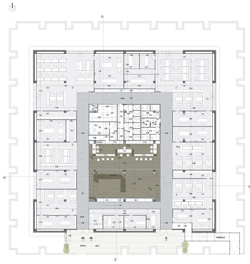 L’intervento è ricucito tramite una zona centrale caratterizzata rispetto l’intorno per materiale e altezza, con il compito di dare importanza alla sede direzionale e creare uno spazio flessibile in grado di rispondere in vario modo alle esigenze lavorative e dell’utenza.