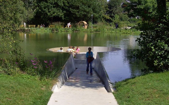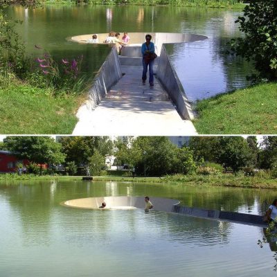 A Vöcklabruck, in Austria, si trova il giardino dell’Oberösterreichischen Landesgartenschau con una piattaforma che permette di camminare sotto la superficie dell’acqua.