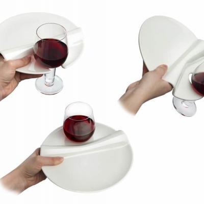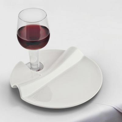 Progettato per banchetto e aperitivo a buffet, il piatto ha un design funzionale ed elegante. Una curva sinuosa separa la bevanda dallo spazio riservato agli stuzzichini ed una fessura consente di riporre il bicchiere da vino o da acqua.