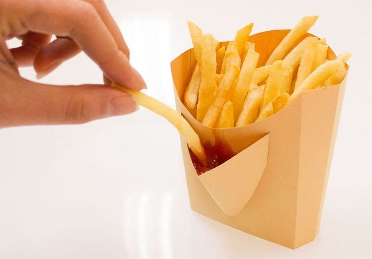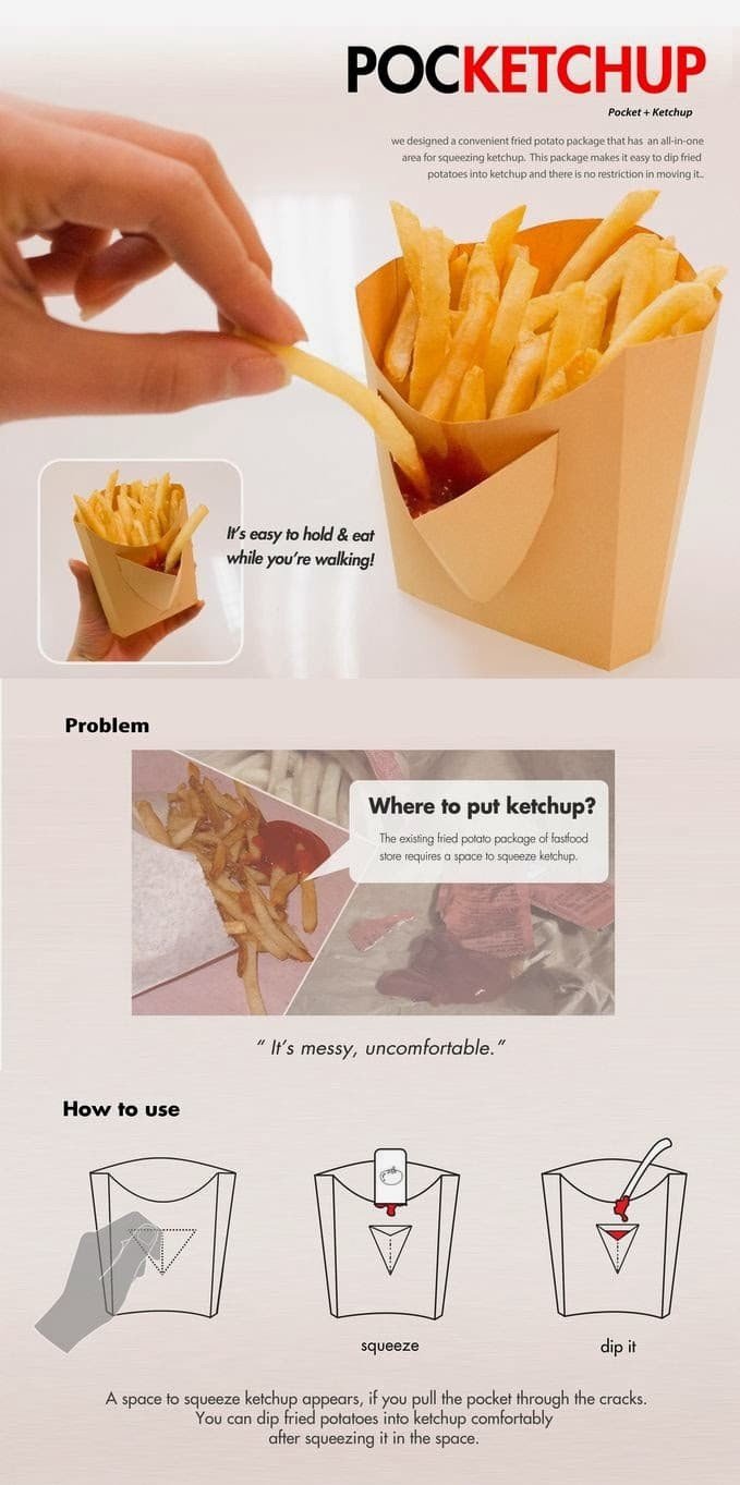 Pocketchup è il packaging ideale per le patatine fritte del fast food. Nato dall’esigenza di rendere più semplice e comodo l’utilizzo di salse come il ketchup o la maionese per condire le vostre patatine fritte, Pocketchup è dotato di una comoda tasca sul fronte del packaging dove poter “spremere” le vostre salse. Grazie a Pocketchup possiamo gustare le nostre salse senza dover per forza condire tutte le patatine fritte.