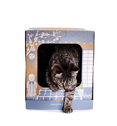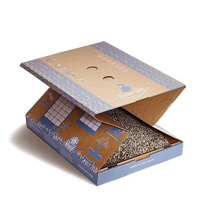 Una lettiera per gatti in materiale riciclato. La struttura è pratica e compatta, realizzata in cartone resistente e di alta qualità. La confezione include tutto l’occorrente necessario per l’uso: sabbia e paletta di cartone per la pulizia.