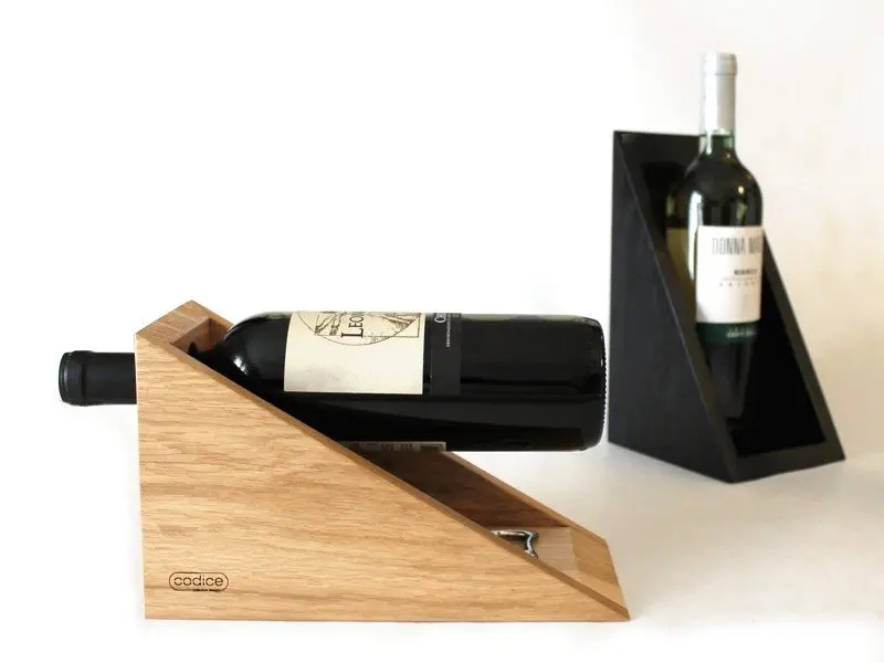 Questo complemento, progettato per la classica bottiglia da 75 cl., mentre la espone ne incornicia forma ed etichetta. Nel legno di rovere, il migliore per la conservazione del vino, un foro regge orizzontalmente la bottiglia offrendola alla vista e alla presa, mentre lo spazio sottostante crea un alloggio per il cavatappi.