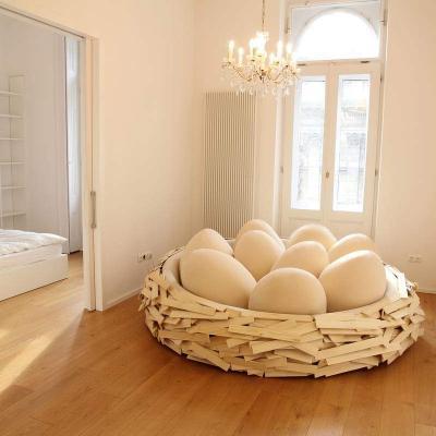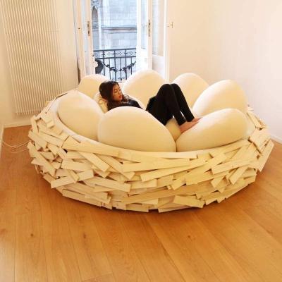 Progettato da OGE Creative Group, “The Giant Birdsnest” è un pouf confortevole concepito e realizzato come spazio di socializzazione. L’intento di soddisfare le necessità di un arredamento pratico e versatile e il desiderio di ricreare un ambiente di incontro e divertimento trovano espressione nel design originale e giocoso della seduta: il pouf ha il singolare aspetto di un nido, che accoglie al suo interno morbidi cuscini a forma di uova.