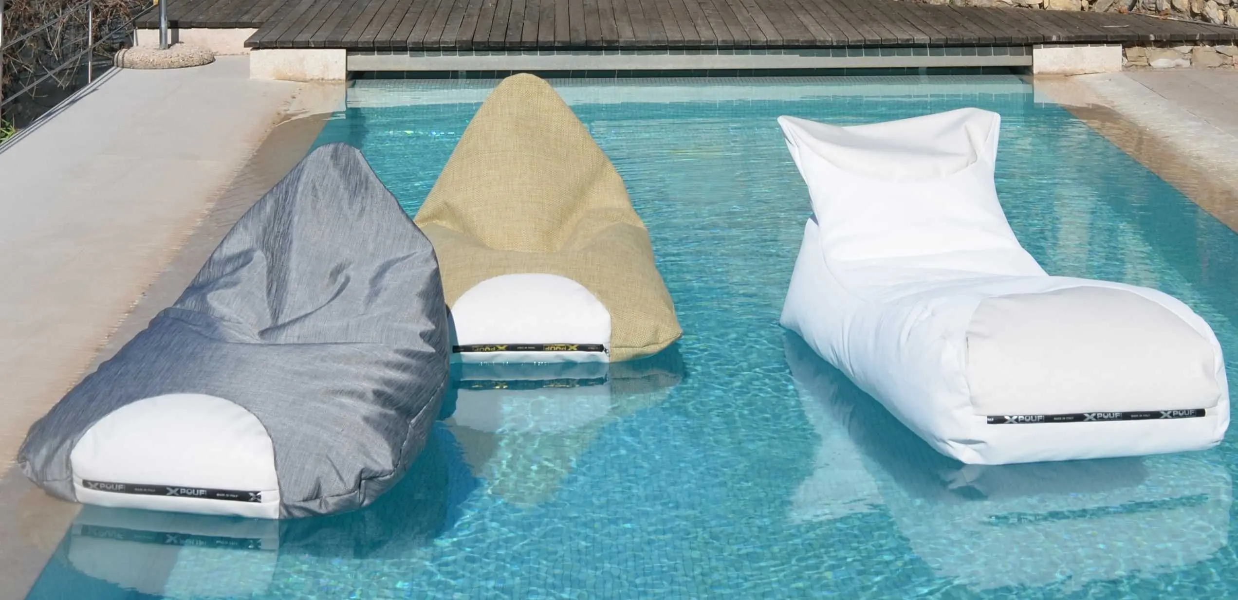 I pouf della collezione INPOOL di XPOUF sono galleggianti grazie alle sfere a cellula chiusa (ovvero impermeabili all’acqua) di poliuretano espanso posizionate all’interno e, grazie allo speciale trattamento Anti-UV e Anti-aging che ritarda il naturale processo di scolorimento dei tessuti, possono rimanere al sole per lungo tempo.
