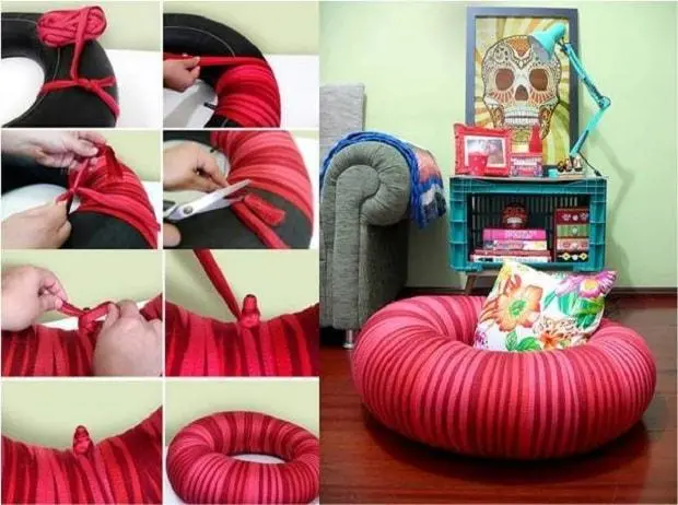 Il pouf gonfiabile ha una struttura semplicissima: una camera d’aria rivestita con la stoffa. E’ bene munirsi di grossi gomitoli di lana o di altro tessuto a fettuccia larga, perché ci vorrà un bel po’ di filato per coprire l’intera superficie.