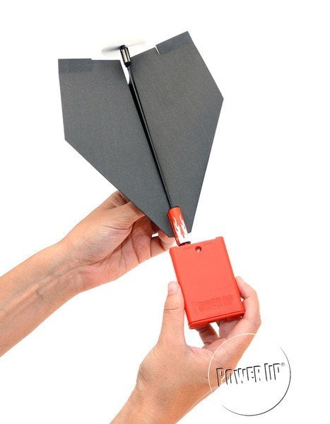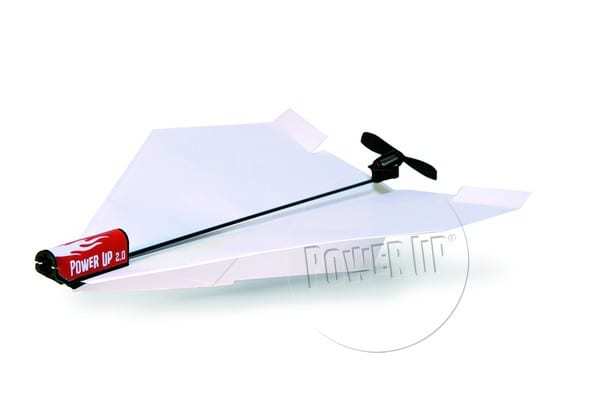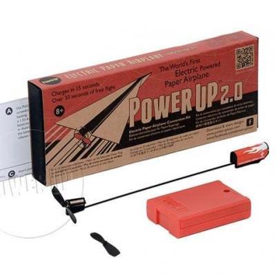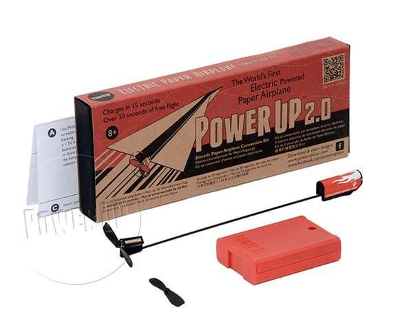 PowerUp 2.0 è un kit, adattabile a qualunque aereoplanino di carta da voi realizzato, per trasformare un semplice areoplanino di carta fatto a mano in un aereomobile elettrico in grado di volare per circa 30 secondi.