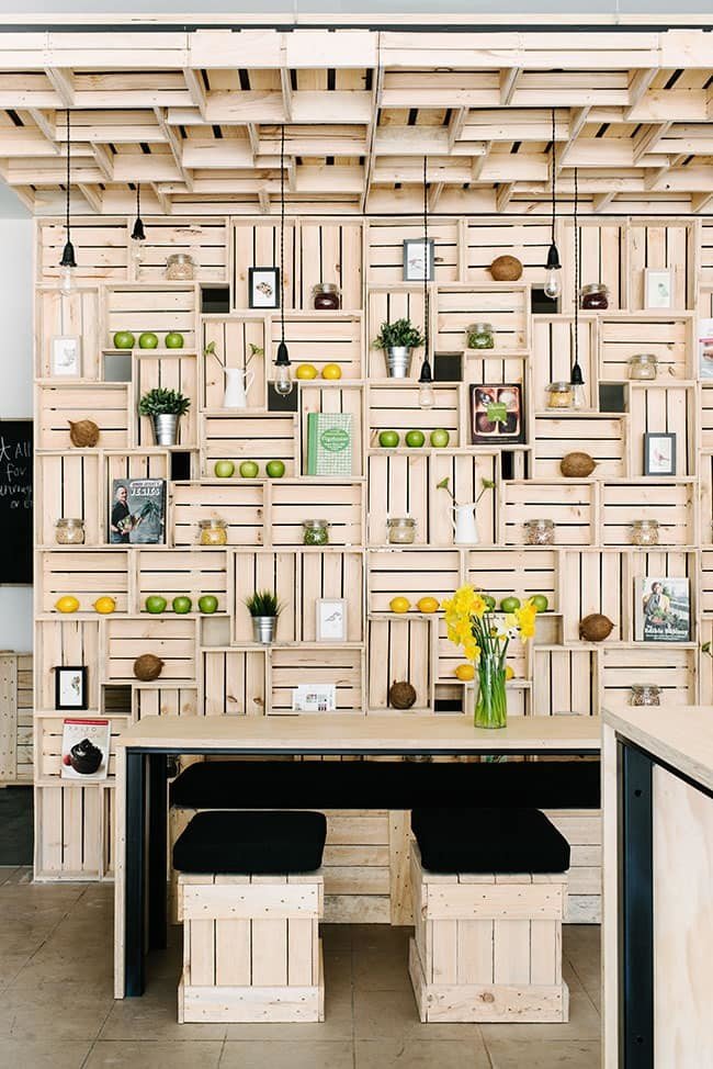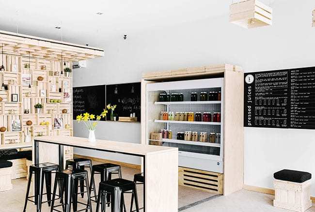 Situato in Australia nella città di South Yarra, il locale in foto è solo uno di una catena di bar chiamati Pressed Juices. Il design è caratterizzato da toni neutri del legno per mettere in risalto i colori dei frutti e delle bottiglie di succo di frutta. Gli ambienti, tutti in legno bianco, nero e naturale, sono stati arredati con il riciclo delle cassette di legno della frutta. Anche i lampadari sono a tema, realizzati anch’essi con delle cassette di legno. Una catena di locali Bio dove è possibile gustare succhi di frutta realizzati con frutta biologica…un luogo dove appagare i sensi del gusto e della vista.