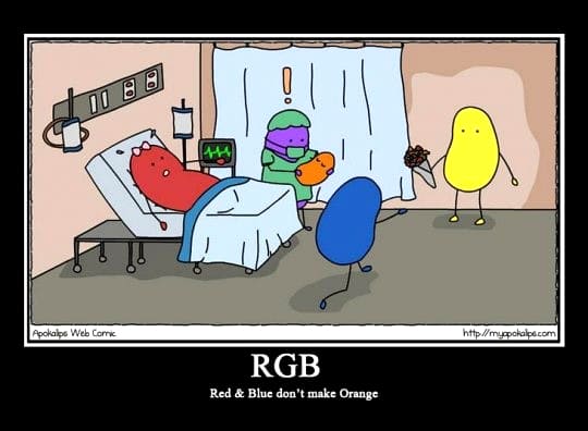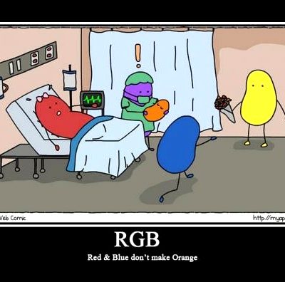 Red and blue don’t make orange 2 Feb 2013 Antonio Italia Total0Myapokalips spiega come funziona il metodo di colore RGB con la simpatica vignetta “Red and blue don’t make orange”.
