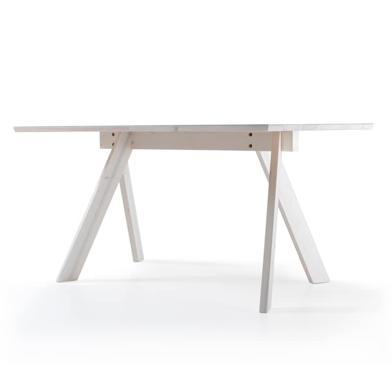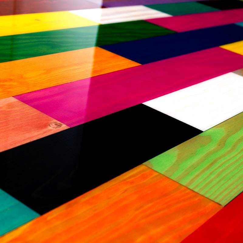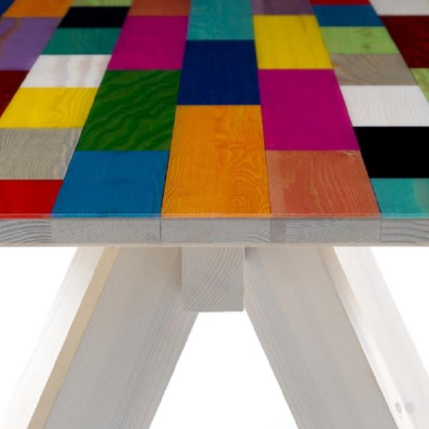 Un tripudio di colori rompe con l’austerità del classico tavolo fratino. Il piano è caratterizzato da diversi listelli in legno colorato, rivestiti da uno strato di resina autolivellante trasparente.