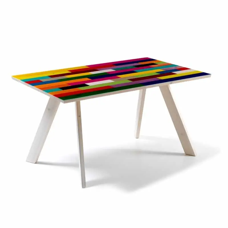 Un tripudio di colori rompe con l’austerità del classico tavolo fratino. Il piano è caratterizzato da diversi listelli in legno colorato, rivestiti da uno strato di resina autolivellante trasparente.