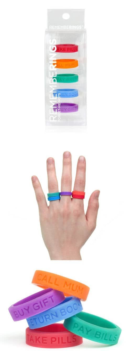 Quando i metodi convenzionali, post-it, nodi al fazzoletto e sveglie non bastano più allora è il momento di usare “RemembeRings” prodotti dalla “Bravo Company” da Singapore. Sono degli anelli realizzati in silicone, dai colori shock, con delle piccole frasi che ci ricordano le cose da fare.