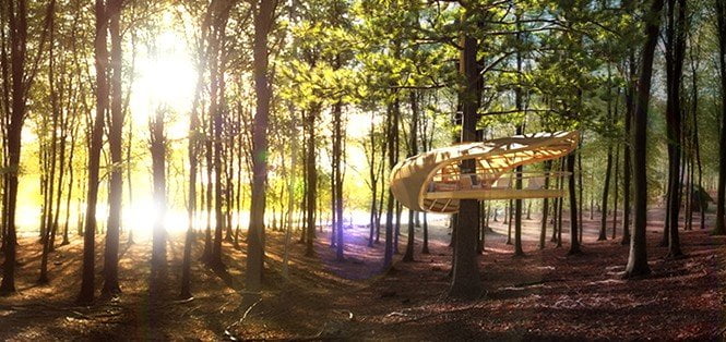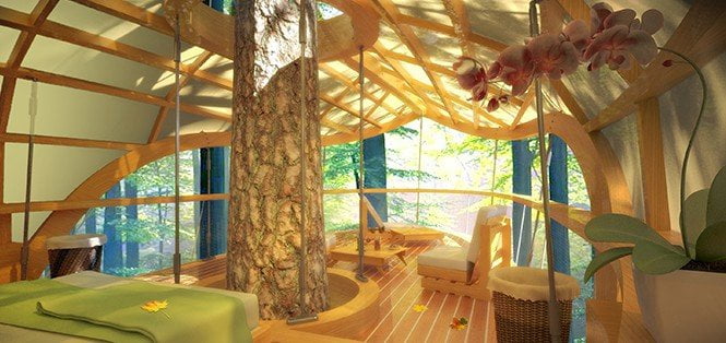 Il complesso a 5 stelle si compone di dodici alloggi sospesi agli alberi, dislocati nella verdeggiante foresta. Le case-albero, dall’elegante forma di sàmara, si armonizzano con il contesto che le ospita, rispettandone le naturali esigenze.