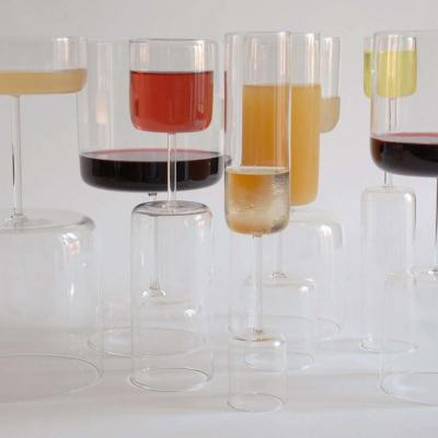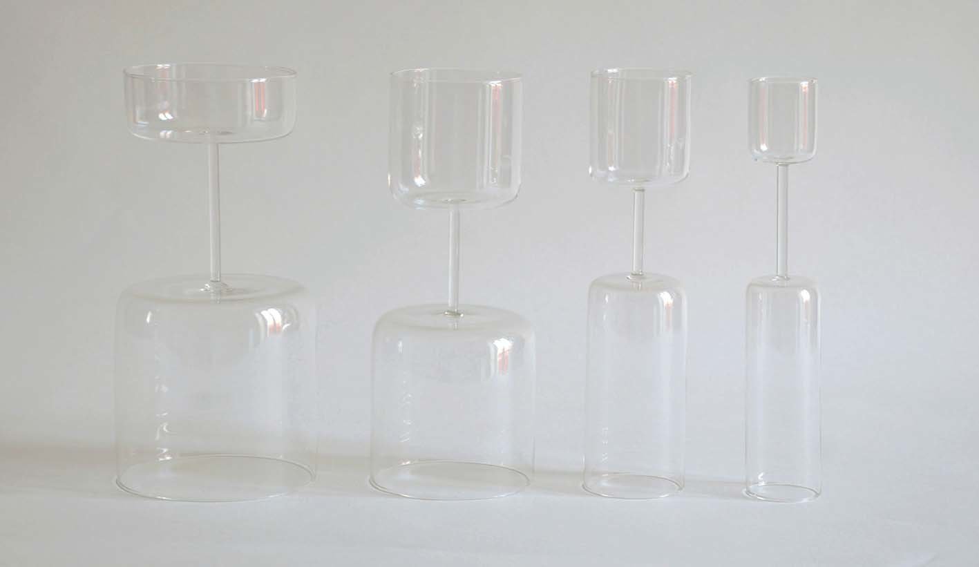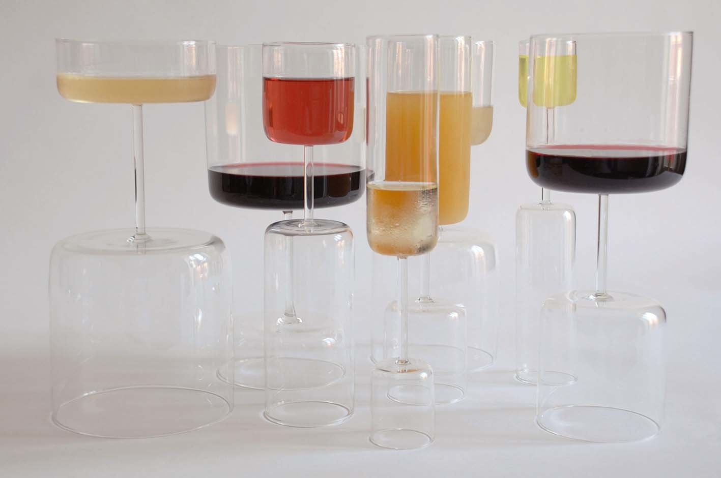 È pensato in 8 diverse misure sintetizzate in 4 oggetti: il “grand ballon” per i vini rossi corposi invecchiati abbinato alla “coppa” per spumanti dolci, il “borgogna” per i rossi corposi con il “renano” per i bianchi strutturati, il “tulipano” per i bianchi leggeri con il “tumbler basso” per il whisky e infine la “flute” per spumanti secchi con lo “shot” per grappa e acquavite.