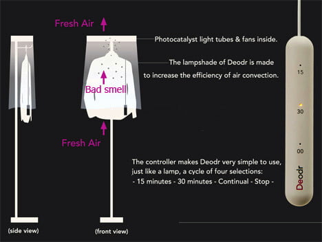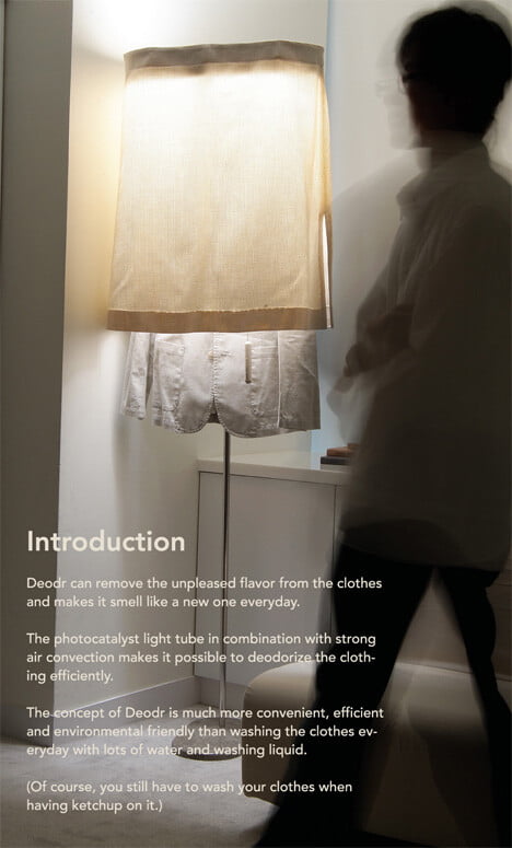 Il lavaggio dei capi è un’attività alla quale non si può rinunciare, ma grazie a Deodr è possibile rinfrescare gli abiti senza dover ricorrere necessariamente alla lavanderia o al bucato in casa. Sviluppato dal designer Wu Kun-chia e messo a punto da Scenario Lab, Deodr consiste in un paralume con aggancio che farà in modo di non dover fare il bucato per quei vestiti usati ma non macchiati o che sono stati lavati da poco.