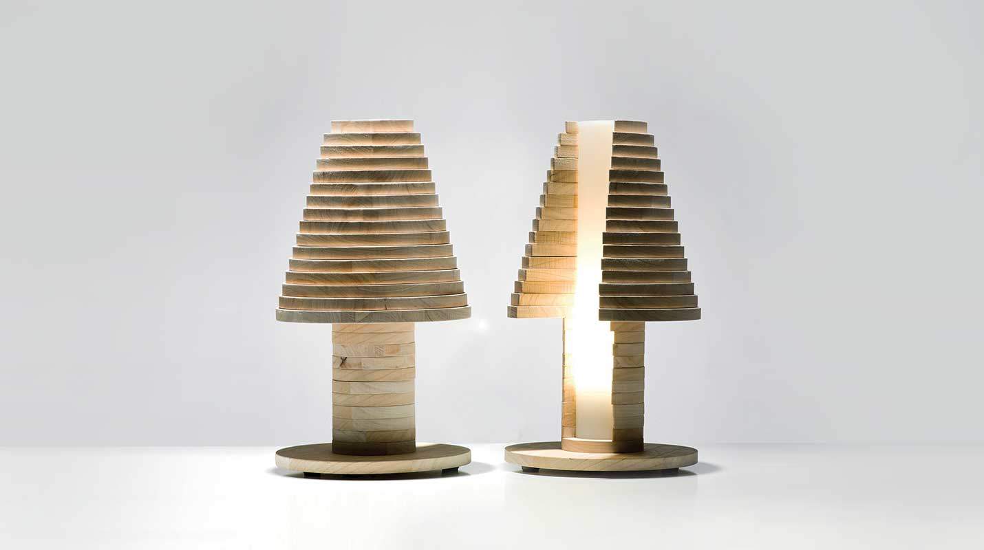Una abat-jour componibile in legno naturale.