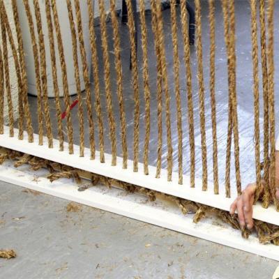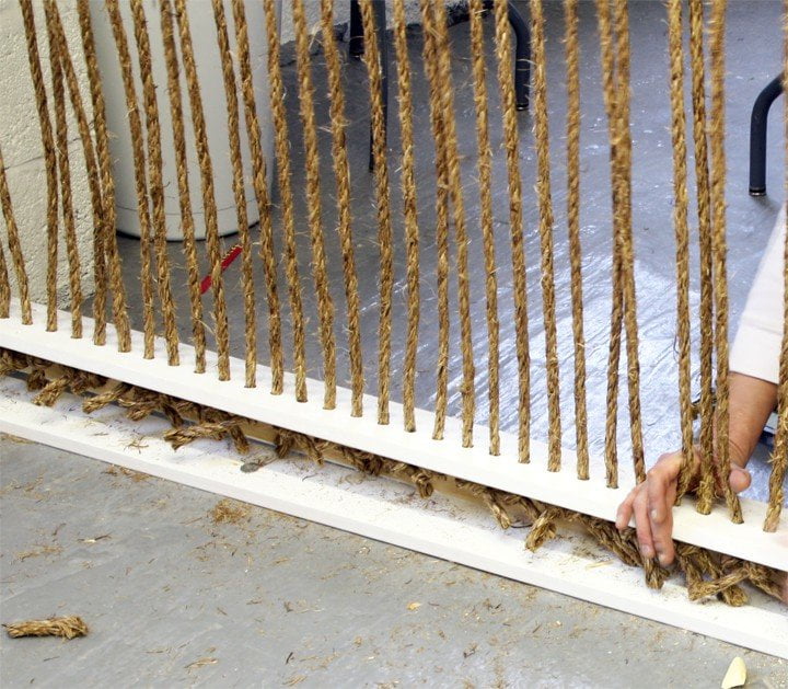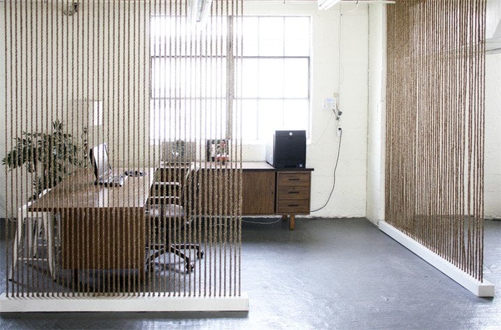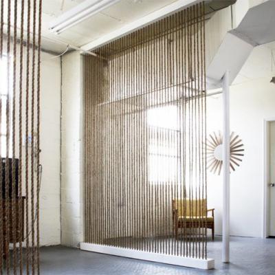 Un progetto per l’ufficio o per la casa, funzionale a separare, con stile, gli spazi di un ambiente open space fresco e moderno. La procedura per realizzare la parete divisoria è semplice ed economica, ma richiede tempo e precisione. Il telaio, che sostiene le corde, è costituito da lunghe scatole di legno fissate sul pavimento e sul soffitto; su entrambe sono stati praticati tanti fori equidistanti, all’interno dei quali sono stati inseriti i segmenti di fune, tesi e bloccati su entrambe le estremità con un nodo. Una volta chiusa la scatola con delle viti, i nodi sono rimasti nascosti all’interno, garantendo alla vista una struttura perfetta e pulita.