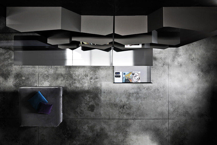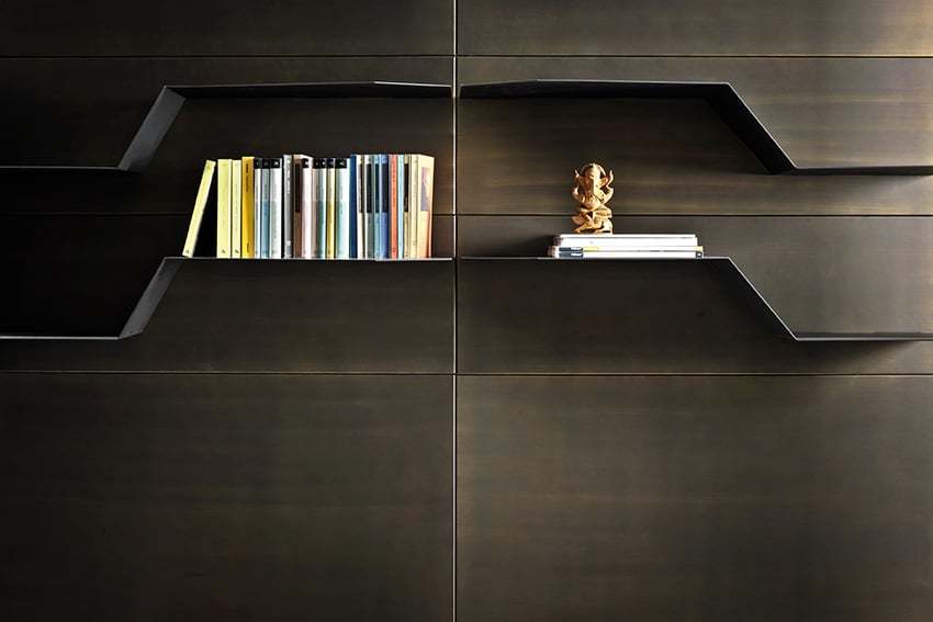 La libreria modulare Iron-ic in ferro dall’inconfondibile profilo ondeggiante offre la possibilità di aggiungere eleganti contenitori perfettamente incassati nella scocca della libreria e diventa Iron-ic Shelter. Il risultato è una libreria dall’innata leggerezza e fluidità grazie alla studiata variazione filante e armonica dei piani orizzontali e verticali e all’effetto tridimensionale dei contenitori che giocano su una diversa profondità rispetto alla libreria creando uno scenografico ed importante effetto 3D. Le finiture della libreria e dei contenitori possono essere combinate liberamente per una personalizzazione nolimits che spazia tra look materici- industriali ed atmosfere di sofisticato luxury.
