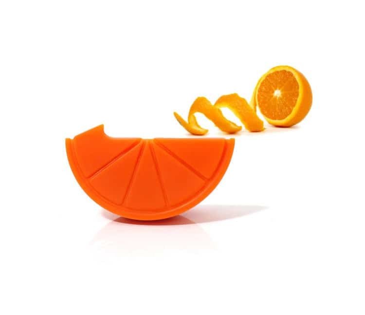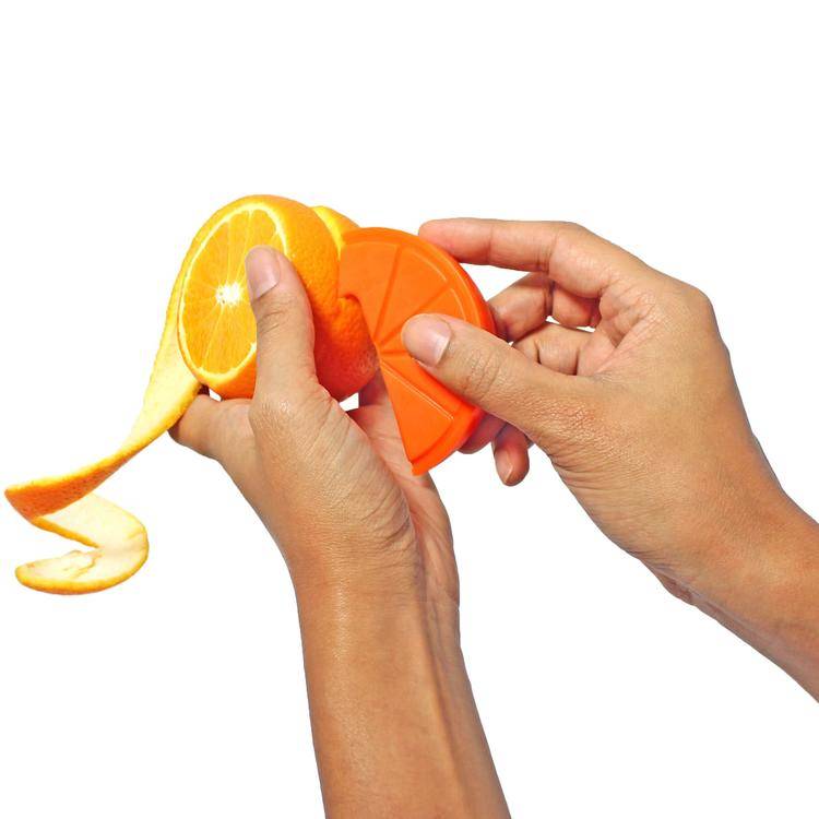 Il simpatico gadget è indicato per frutti a buccia spessa, come le arance, che ne ispirano il design. Semplice ed intuitivo, l’accessorio è dotato di un’estremità tagliente che consente di incidere con estrema agevolezza il frutto: basta disegnare una spirale sulla superficie, ed eliminarla sollevando la stessa dalla polpa.