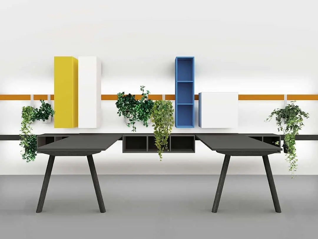 Milo è un sistema di madie su basamenti e contenitori pensili, agganciati ad una barra retroilluminata che ricorda la linea dell’orizzonte e contribuisce a conferire un senso di benessere all’ambiente ufficio. La libertà compositiva è massima. Gli elementi del sistema possono avere forma quadrata e rettangolare, sono disponibili in diversi colori, con ante oppure con scaffalatura a giorno, e possono essere appesi liberamente nella posizione desiderata.