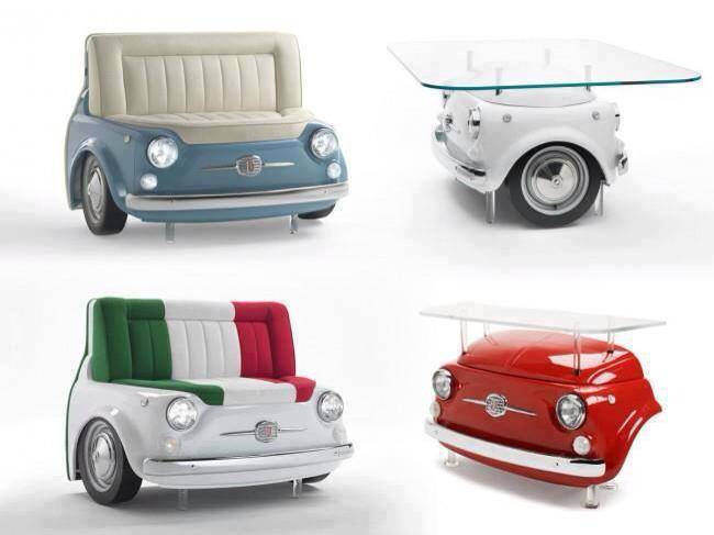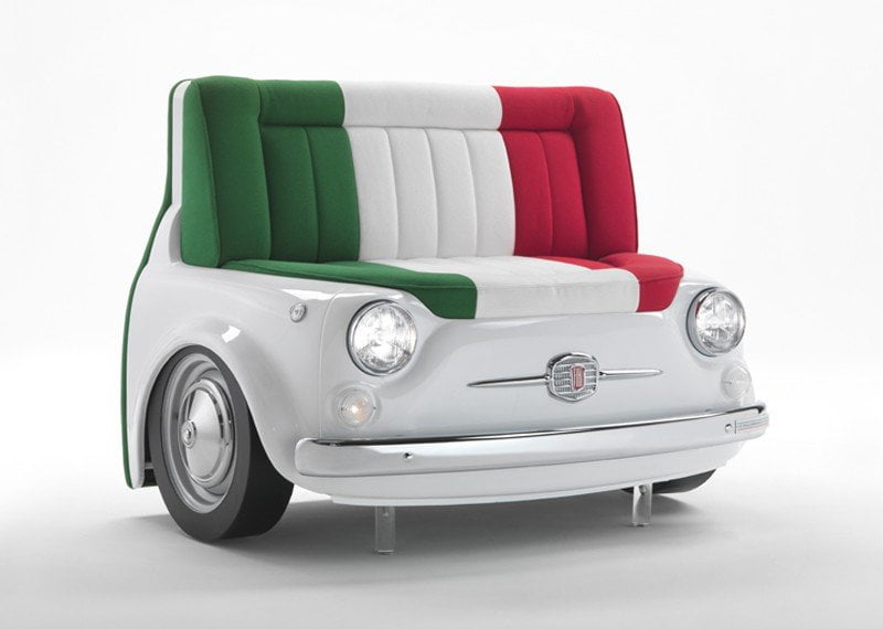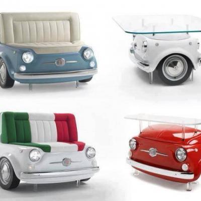 I Sofà Panorama sono una serie di divani che riproducono la parte frontale della mitica Fiat 500 degli anni ’70. In abbinamento anche i tavolinetti Picnic (tavolino bifronte) e CinCin (tavolino da muro), per un salotto in tema. Disponibile in differenti colori, altre immagini su meritalia.it