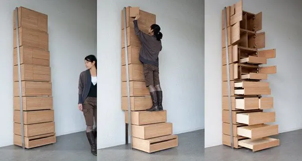 Staircase di Danny Kuo: la soluzione ideale per sfruttare al meglio gli spazi domestici! Staircase è una cassettiera verticale alta 2,6 mt., dotata di comodi cassetti di diverse dimensioni, che, all’occorrenza, possono essere utilizzati come gradini, per riporre oggetti ed indumenti nei ripiani più alti.