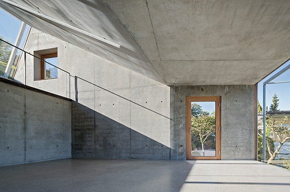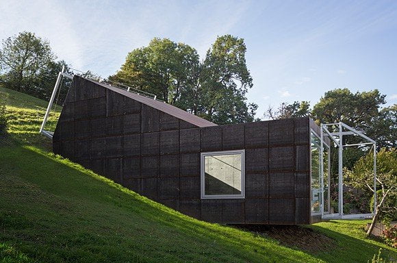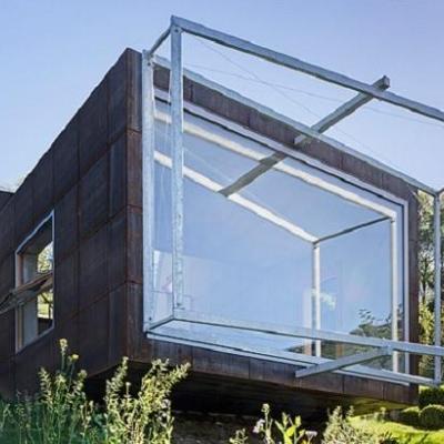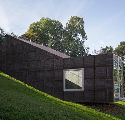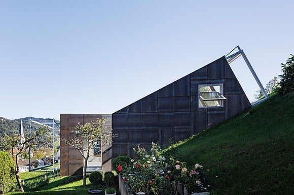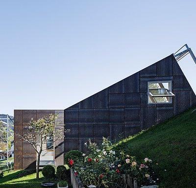 I pannelli della facciata sono realizzati in acciaio, mentre le superfici interne in cemento grezzo, acciaio grezzo e rovere non trattato.