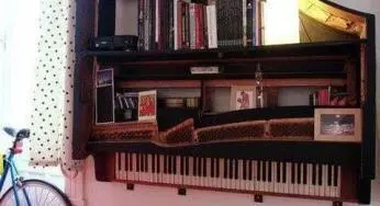 Se avete un vecchio pianoforte non funzionante potete riutilizzarlo come libreria appoggiandolo alla parete in verticale. Via pinterest.com
