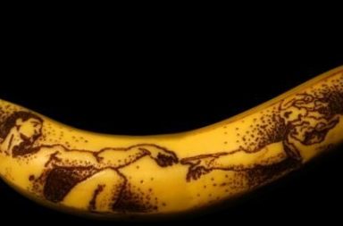 Con un punteruolo il pittore americano Phil Hansen disegna opere di Michelangelo e altri artisti sulla buccia di una banana. Via l…