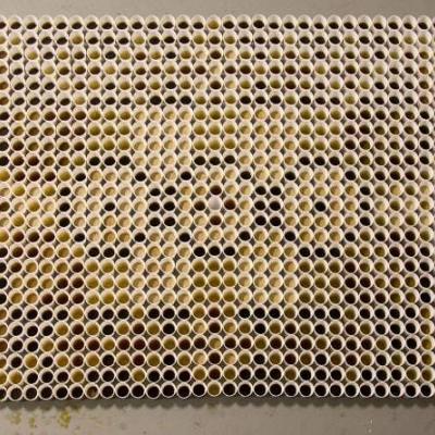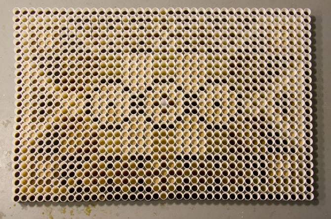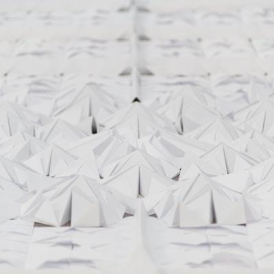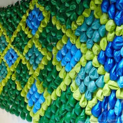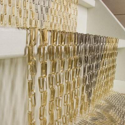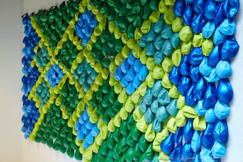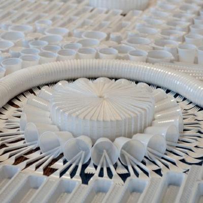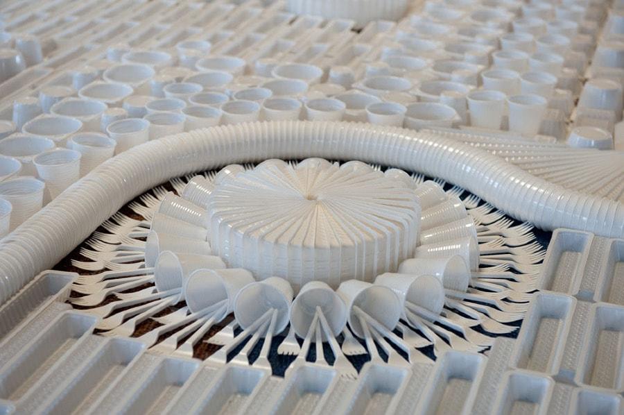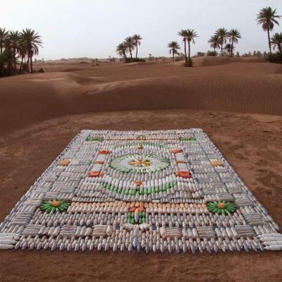 I materiali utilizzati sono oggetti che generalmente vengono gettati via dopo l’uso, perdendo la loro utilità, come forchette di plastica, piastrelle per la pavimentazione, batuffoli di cotone, chiodi. Tutti questi elementi sono composti in modo creativo per formare complessi disegni grafici. Il risultato è molto più di un tappeto decorativo: è un oggetto che, per come progettato e per la scelta dei materiali “tessili” impiegati, riflette la società consumi, fornendo un’interpretazione contemporanea del valore e della ricchezza.