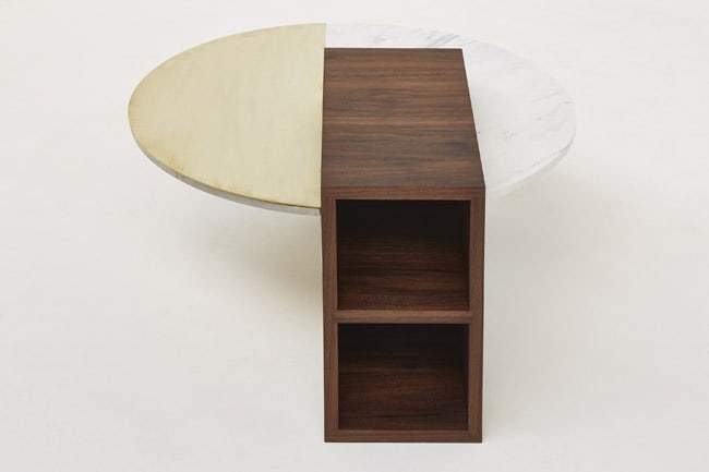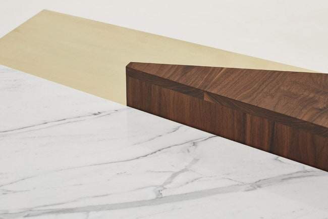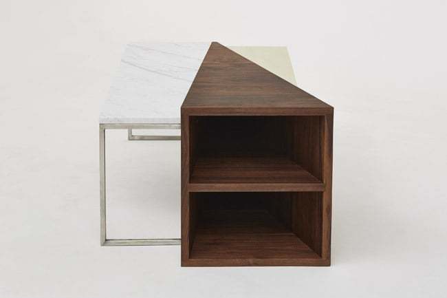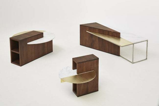 Il trio di mobili Algebra Series è composto da scaffalature in noce e da lastre in marmo statuario e ottone… Elementi dissimili armonicamente sovrapposti…
