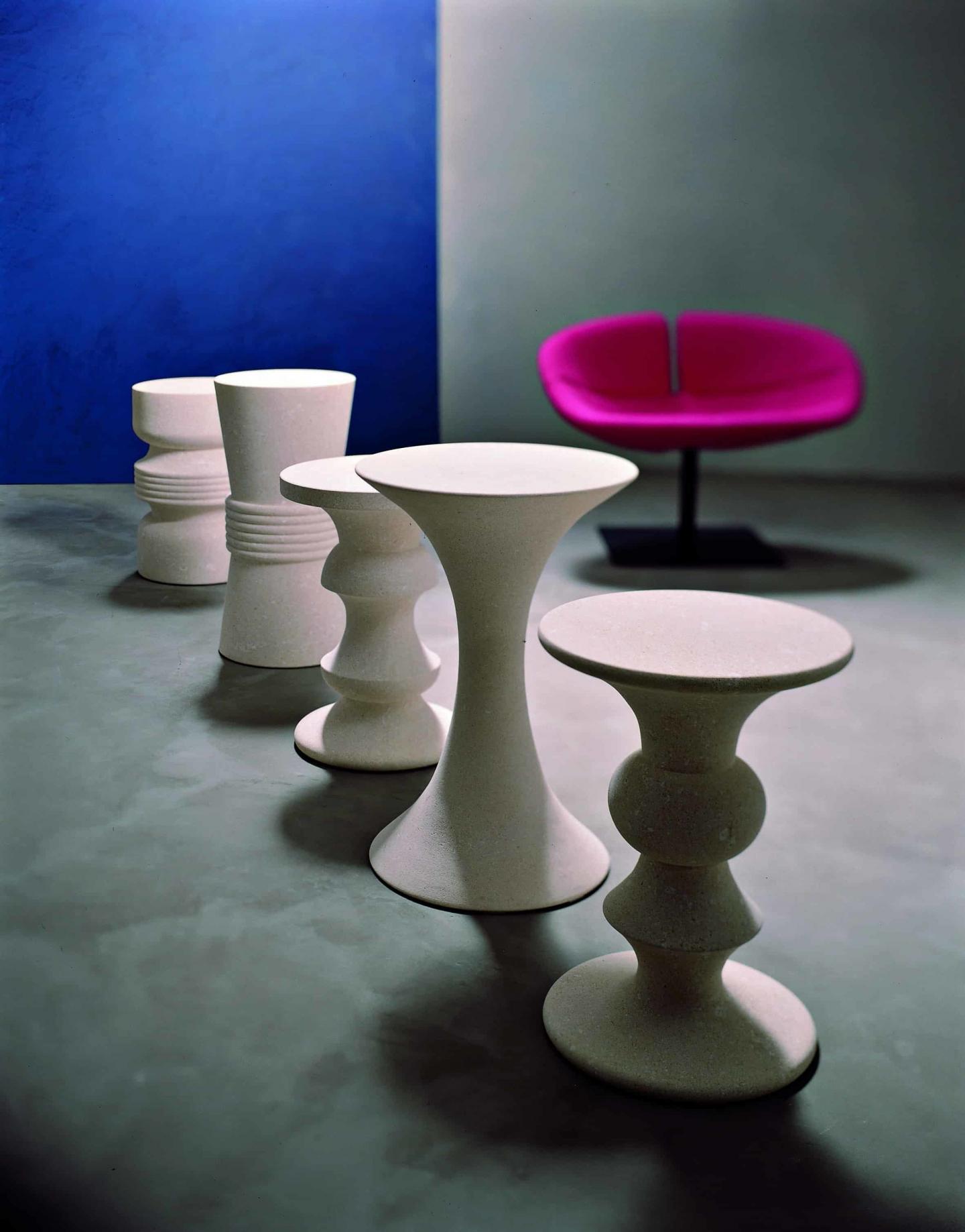 Raffinati e ironici, scultorei e dalla doppia valenza, Sam, Tizia, Loch, Cek e Babe. Sono i tavolini e sedute polifunzionali, di diverse misure e forme, ispirati al gioco degli scacchi, nati dal sorprendente estro creativo del progettista e dalla sapiente lavorazione della Pietra di Vicenza del Laboratorio del Marmo by Grassi Pietre.