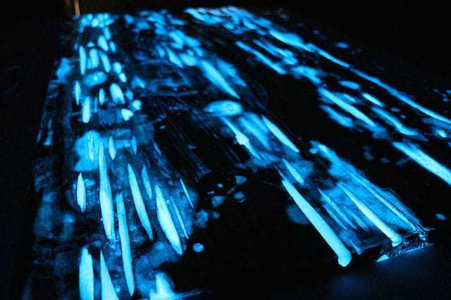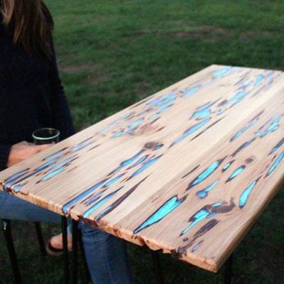 Il progetto unisce creatività e riciclo, poiché prevede il recupero di assi di legno malandate. Ogni tavola è stata scavata, rimuovendo le parti debilitate da funghi, umidità ed altri agenti. Le insenature sono state poi riempite con la resina. Insomma, non preoccupatevi se il materiale che avete reperito sembra ridotto agli ultimi termini, perché più saranno le parti rovinate, maggiore sarà l’effetto fluo!