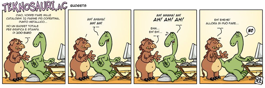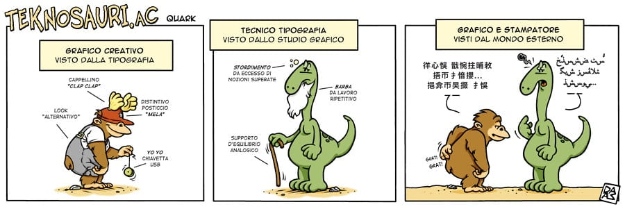 Segnaliamo il blog TeknoSauri.aC con le divertentissime strip realizzate dall’illustratore italiano Davide Zamberlan, in arte DaZa, dedicate al mondo della grafica e dintorni. Ogni lunedì potete leggere le avventure dei personaggi della KK Service, molto spesso dichiarate 100% True. Inseritelo tra i preferiti 😉