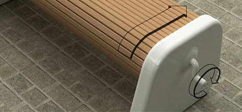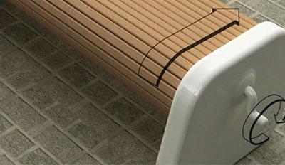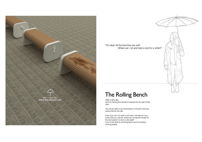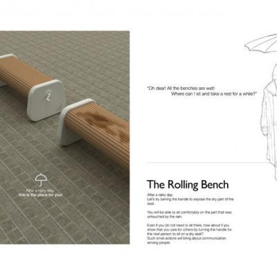 “The Rolling Bench” è la panchina che resta sempre asciutta, si colloca perfettamente nell’arredo urbano delle nostre città. Ha la seduta che può ruotare attraverso una leva posta sul fianco della seduta, ciò fa in modo di restare sempre asciutta.