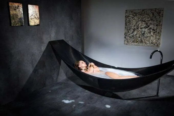 Splinter Works ha realizzato THE VESSEL, una vasca da bagno sospesa (non tocca il paviemento) a forma di amaca, in carbonio, ideale per il completo relax. La vasca si riempie grazie a un rubinetto e si svuota attraverso uno scarico nel pavimento.