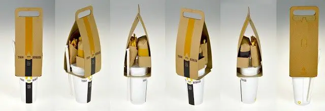 Il #designer industriale Seulbi Kim ha realizzato il Togo Burger, un packaging innovativo in cartone pieghevole per trasportare facilmente il pranzo del fast food con una mano, panino, patatine e bibita.