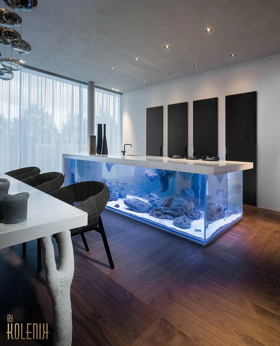 Realizzata per una sontuosa e perfetta per arredare cucine di lusso, la creazione ha ispirato curiose richieste di personalizzazione, per incorporare acquari nei luoghi più insoliti.
