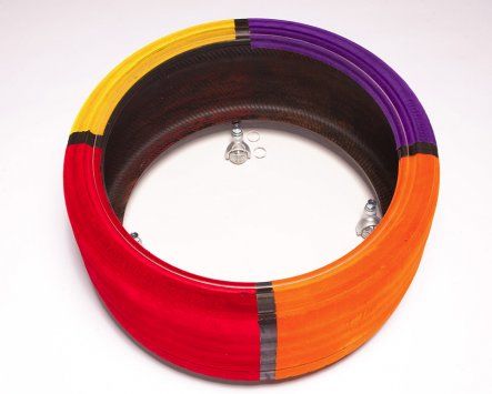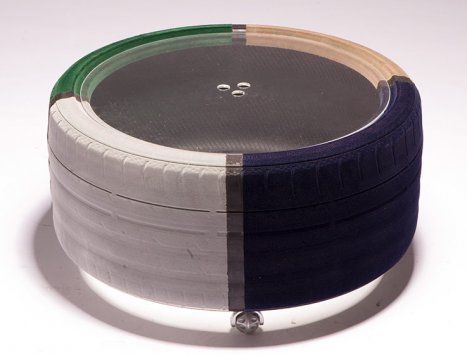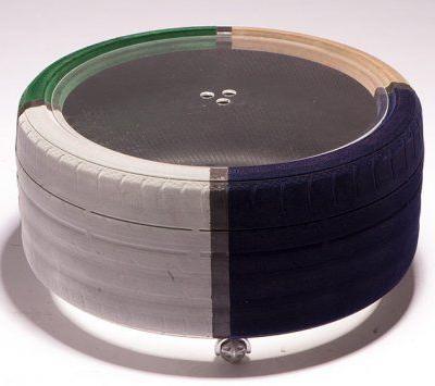 Il tavolo si compone di uno pneumatico poggiato su un disco di plexiglass, a sua volta sorretto da 4 pratiche ruote, che consentono di spostare l’oggetto secondo necessità.