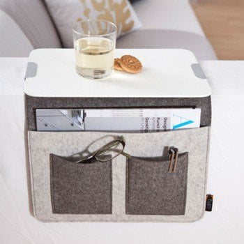 Adattabile a divani sia con bracciolo rotondo sia rettangolare, è realizzato in feltro, e dotato di una mensola in legno rimovibile.